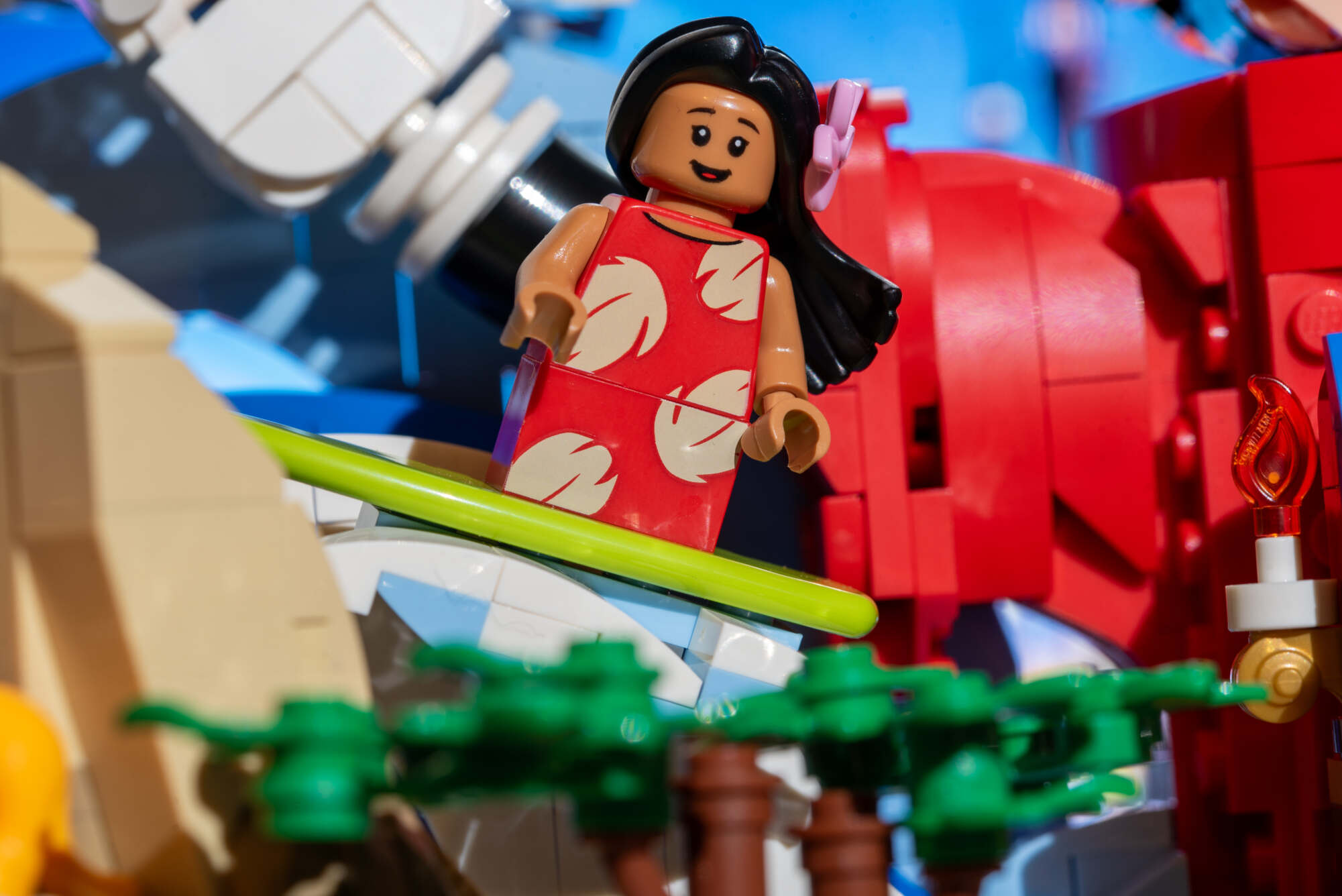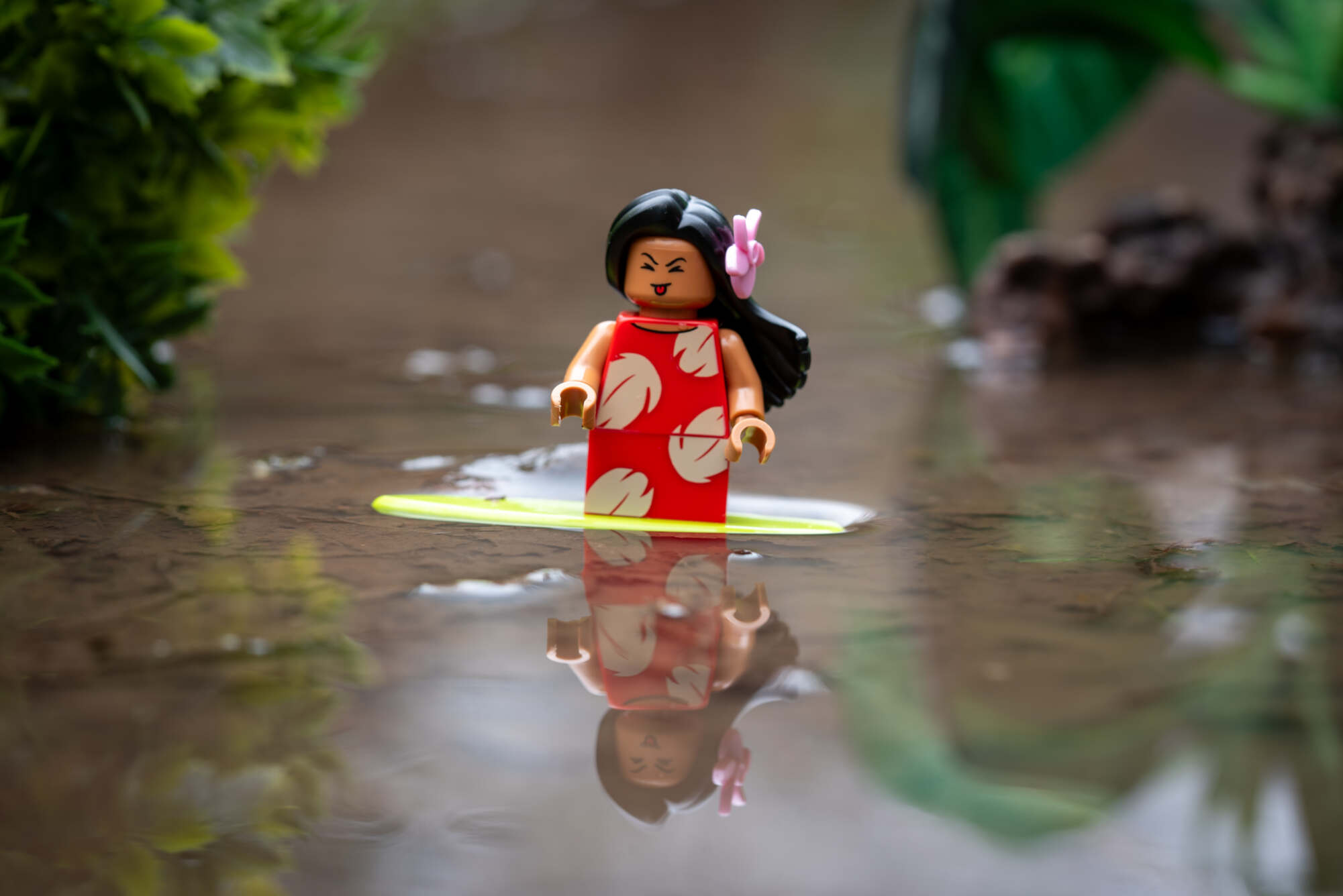 Well, you can’t have a minifigure of Lilo with her surfboard and not be inspired to take an image in the water. This simple image was created with some plastic fish tank plants in the background to give additional variety to the puddle.