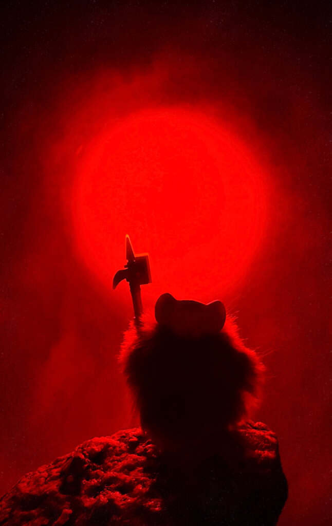 The next step was to visualize what soulfire would look like. I decided that if my soul were on fire, it would have to be glowing red. Plus I needed a toy that can also strike a pose of self-determination while standing in personal strength. These are the ideas and feeling I want to convey in my image. While looking through my little folks in plastic, I landed on a Mouse Guard figure from Crazy Bricks.